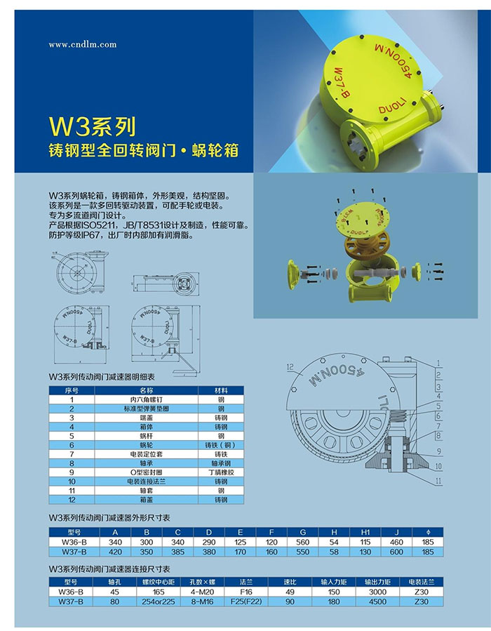 W3系列蝸輪箱,殼體采用WCB鑄造,蝸桿兩端使用圓錐滾子軸承支撐,該系列是一款多回轉驅動裝置,可選配手輪或電裝。適用于閘門,三通球閥等。